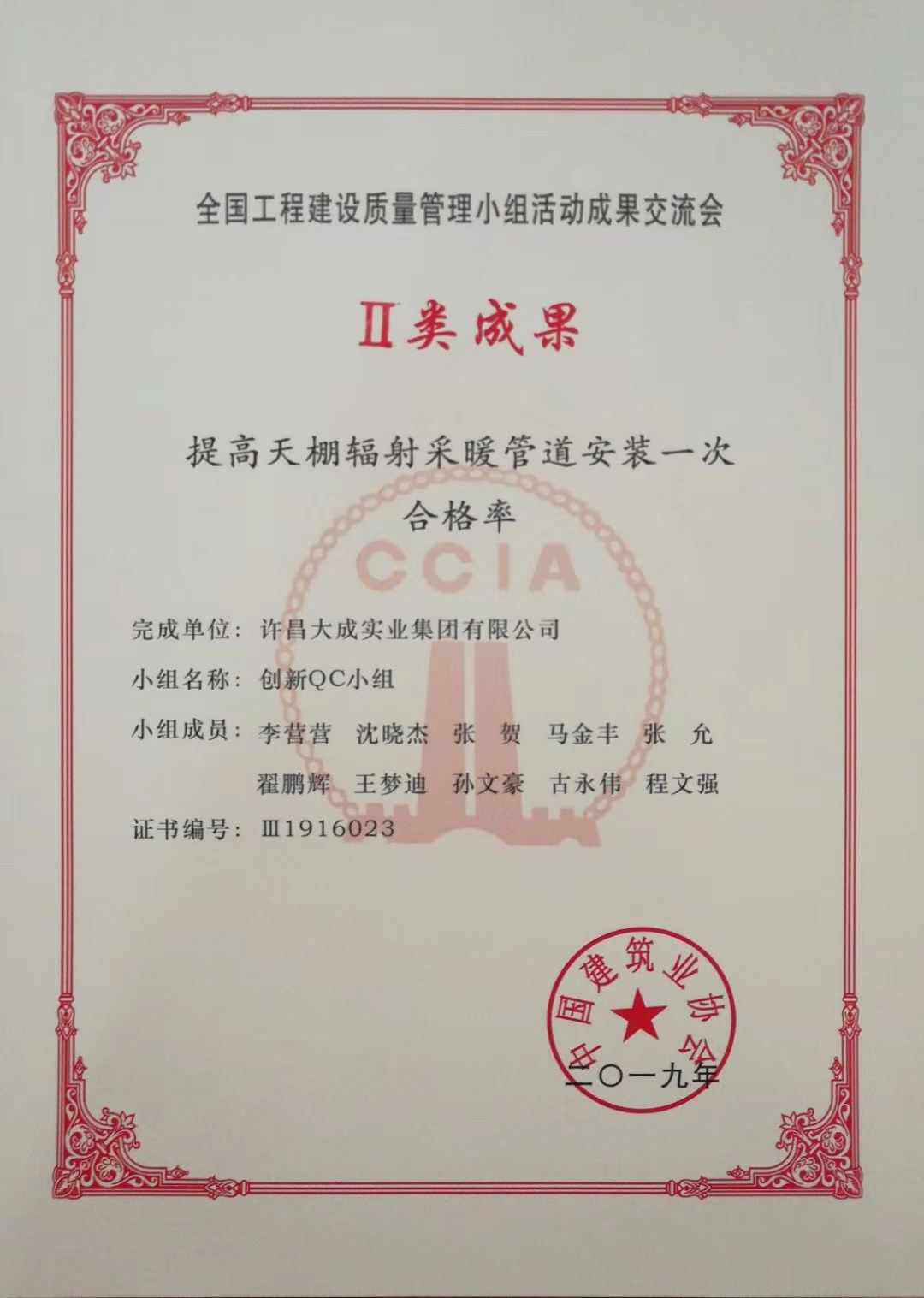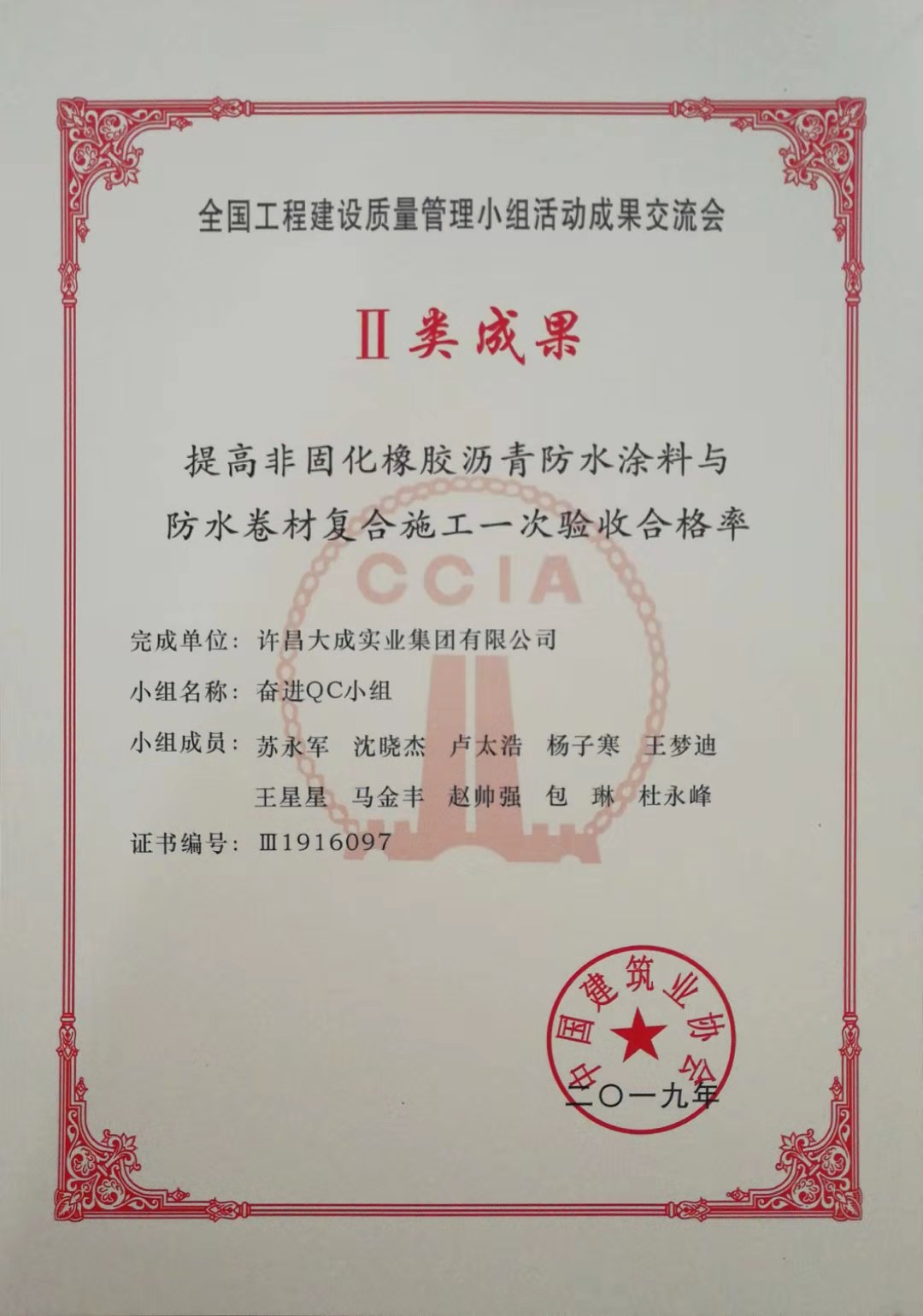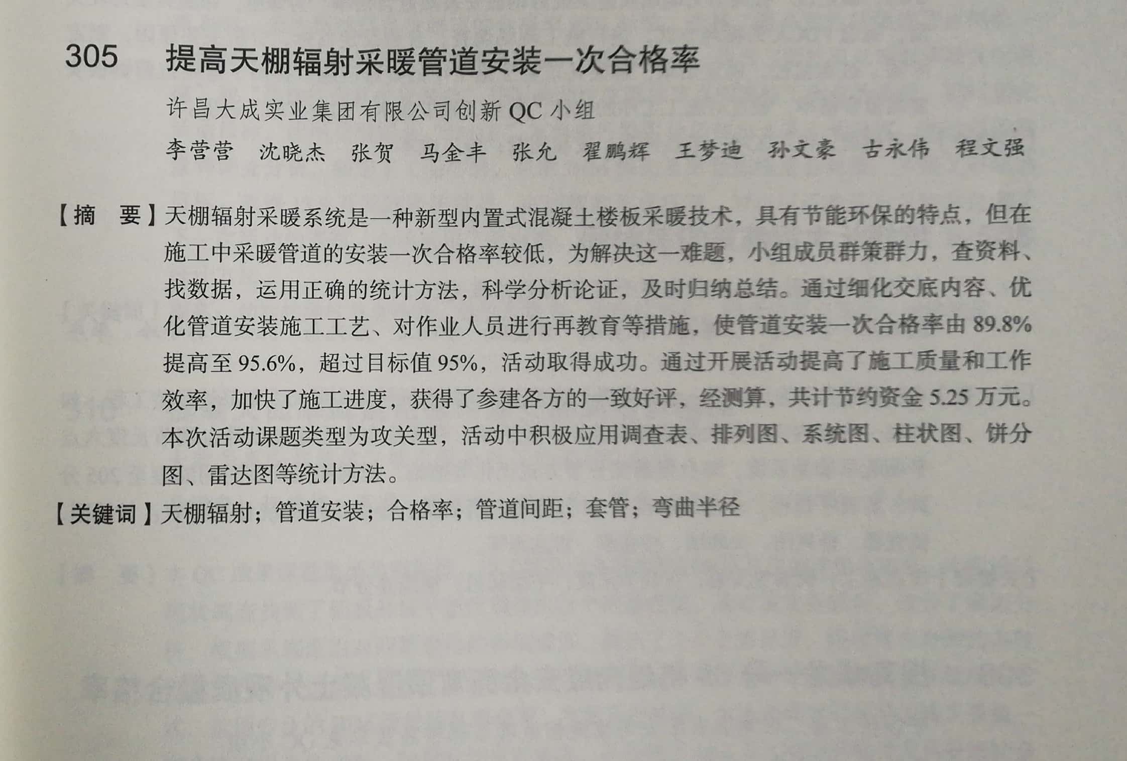國家級(jí)優(yōu)秀質(zhì)量管理成果交流活動(dòng)競爭非常激烈,每年全國各地推薦指標(biāo)有限,成果質(zhì)量要求較高。我公司兩項(xiàng)成果在省內(nèi)行業(yè)協(xié)會(huì)發(fā)布均為一等獎(jiǎng),作為河南省優(yōu)秀質(zhì)量管理成果被推薦參加國家級(jí)發(fā)布交流會(huì),其中發(fā)布成果《提高天棚輻射采暖管道安裝一次合格率》以選題新穎、活動(dòng)記錄完整、過程資料詳實(shí),得到了與會(huì)專家和行業(yè)同仁的肯定和認(rèn)可,被匯編入《全國工程建設(shè)質(zhì)量管理小組活動(dòng)成果選編(2019)》中。交流成果《提高非固化橡膠瀝青防水涂料與防水卷材復(fù)合施工一次驗(yàn)收合格率》也以PDCA程序正確、統(tǒng)計(jì)工具運(yùn)用得當(dāng)被認(rèn)定為Ⅱ類成果。