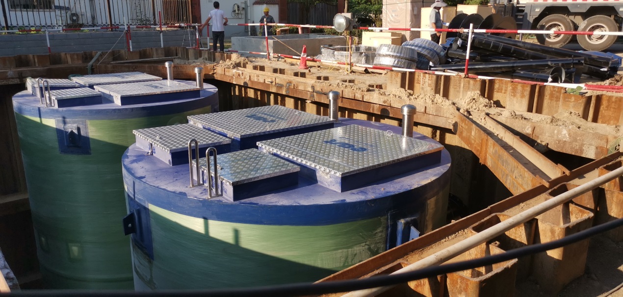從工程整體規(guī)劃來看,該項(xiàng)目服務(wù)范圍明確,涵蓋文興路以東、許由路以南、金葉大道以北、清潩河以西區(qū)域的雨水排放,規(guī)劃匯水面積約 181.74 公頃,泵站總設(shè)計(jì)流量約 9.09m³/s。在排水系統(tǒng)布局上,采取 “新舊結(jié)合” 的思路,充分利用現(xiàn)狀泵站(規(guī)模 4m³/s,配備 4 臺潛水軸流泵,單泵流量 1m³/s、揚(yáng)程 5.5m、功率 90kW),同時(shí)新建一體化雨水泵站(規(guī)模 5.12m³/s)。新建泵站采用 2 座 Φ4.2m×10m 玻璃鋼筒體,設(shè)置 4 臺軸流泵(單泵流量 1.28m³/s、揚(yáng)程 9.8m、功率 185kW),配套設(shè)施完善,包括前池 2 套回轉(zhuǎn)格柵、潛污泵排水系統(tǒng)、DN800 強(qiáng)排管道及拍門、1250kVA 箱變等。